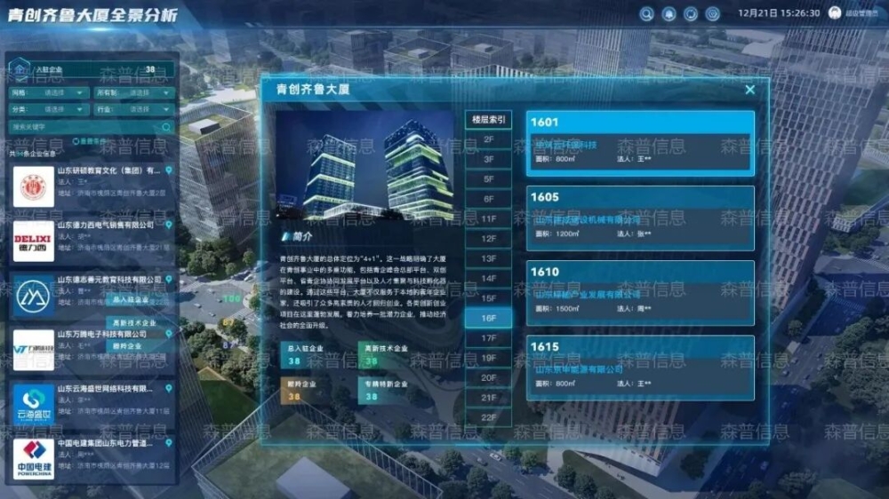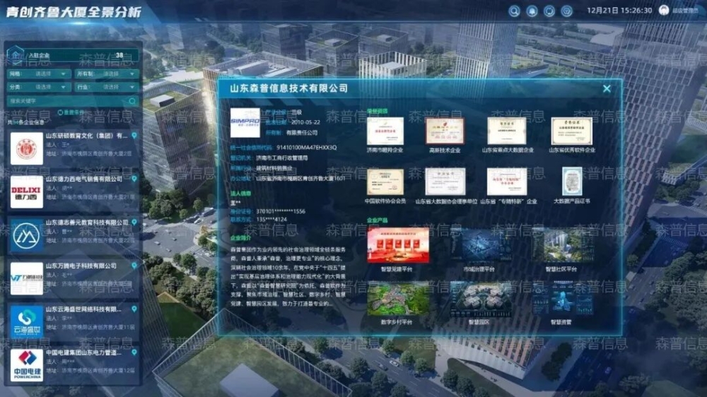 传统模式下,对两企三新群体的管理往往陷入信息孤岛困境。智慧治理平台为辖区内每一家企业、每一个组织建立"一企一档"数字档案,全面涵盖从基本信息、经营状况、人员构成到资质许可、奖惩记录等多维度数据,为每个市场主体绘制精准的数字画像,奠定精细化管理的数字基座。平台通过楼层索引、行业分类、所有制类型等多维度筛选功能,实现对入驻企业的精准定位。