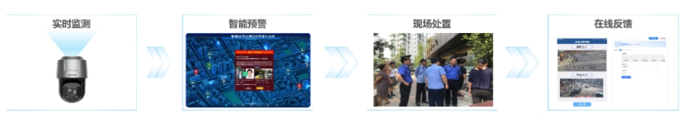 AI监测预警依照实时监测、智能预警、现场处置、在线反馈四个模块,科学模拟和还原“发现-预警-处置-反馈”的工作流程。