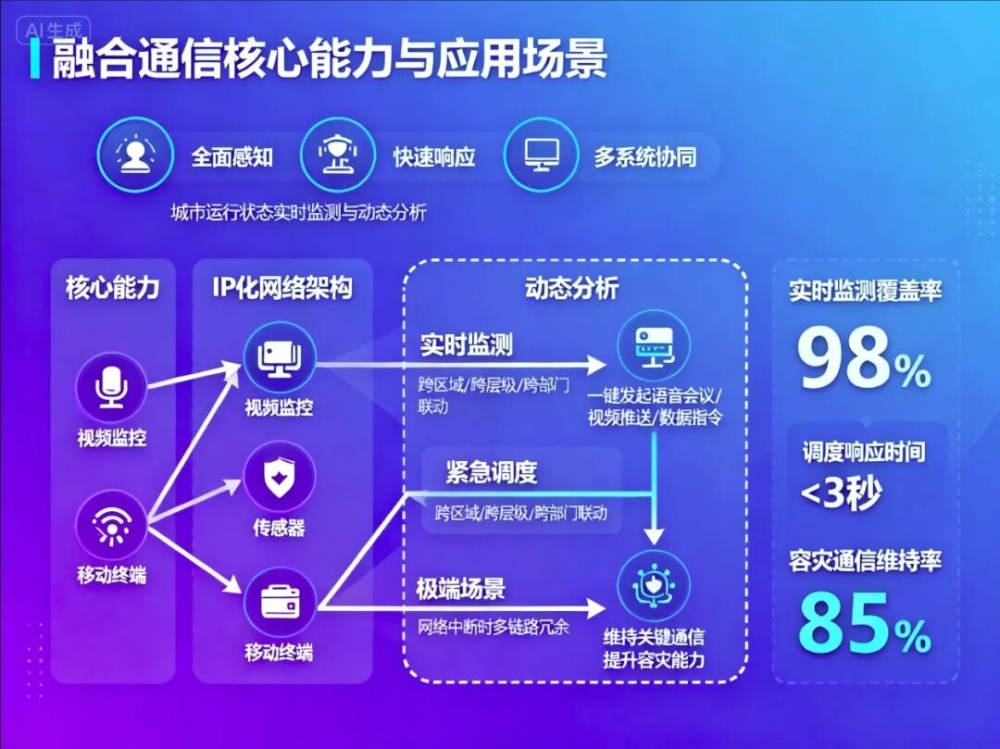 融合通信的核心能力体现在全面感知、快速响应与多系统协同三个方面。借助IP化网络架构,它可整合视频监控、传感器、移动终端等多类信息源,实现城市运行状态的实时监测与动态分析。在紧急情况下,指挥中心可通过一键调度功能,同时发起语音会议、视频推送、数据指令下发等操作,实现跨区域、跨层级、跨部门的高效联动。即便在部分网络中断的极端场景下,系统仍能通过多链路冗余机制维持关键通信,显著提升城市的容灾能力。