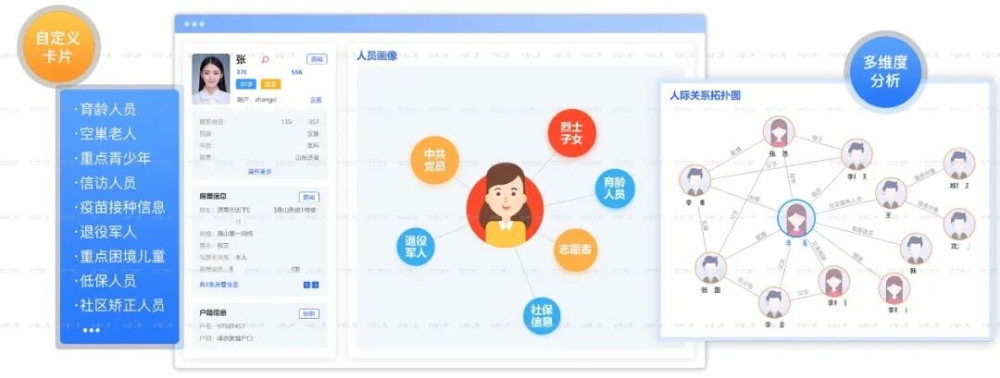 仅仅掌握基础身份信息,已难以应对日益复杂的社会治理需求。现代管理更需要了解人的居住情况、行为动态、社会关联乃至潜在风险。于是,在“一人一档”的基础上,平台拓展出X个维度的属性管理体系。“X”所代表的信息维度围绕几个关键方面展开,例如,居住空间信息,清晰记录人的住所情况及产权关系;动态行为信息,感知人的活动轨迹与异常情况;关联对象信息,勾勒出包括家庭成员、同住人在内的社会关系网络。通过将这些维度有机组合,平台能够绘制出清晰的“人际关系拓扑图”,帮助管理者实时掌握“人住在哪、在做什么、与谁关联、有何风险”,为实现精准治理和服务提供了多角度、立体化的依据。